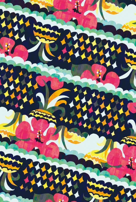 かりゆしウェア テキスタイルデザインコンテスト2019 波と花と果物と好きな沖縄モチーフを組み合わせて、ポップで可愛いイメージのかりゆしデザインをデザインしました。投稿者:北村友莉 Twitter Facebook LINE -かりゆしウェア テキスタイルデザインコンテスト2019
