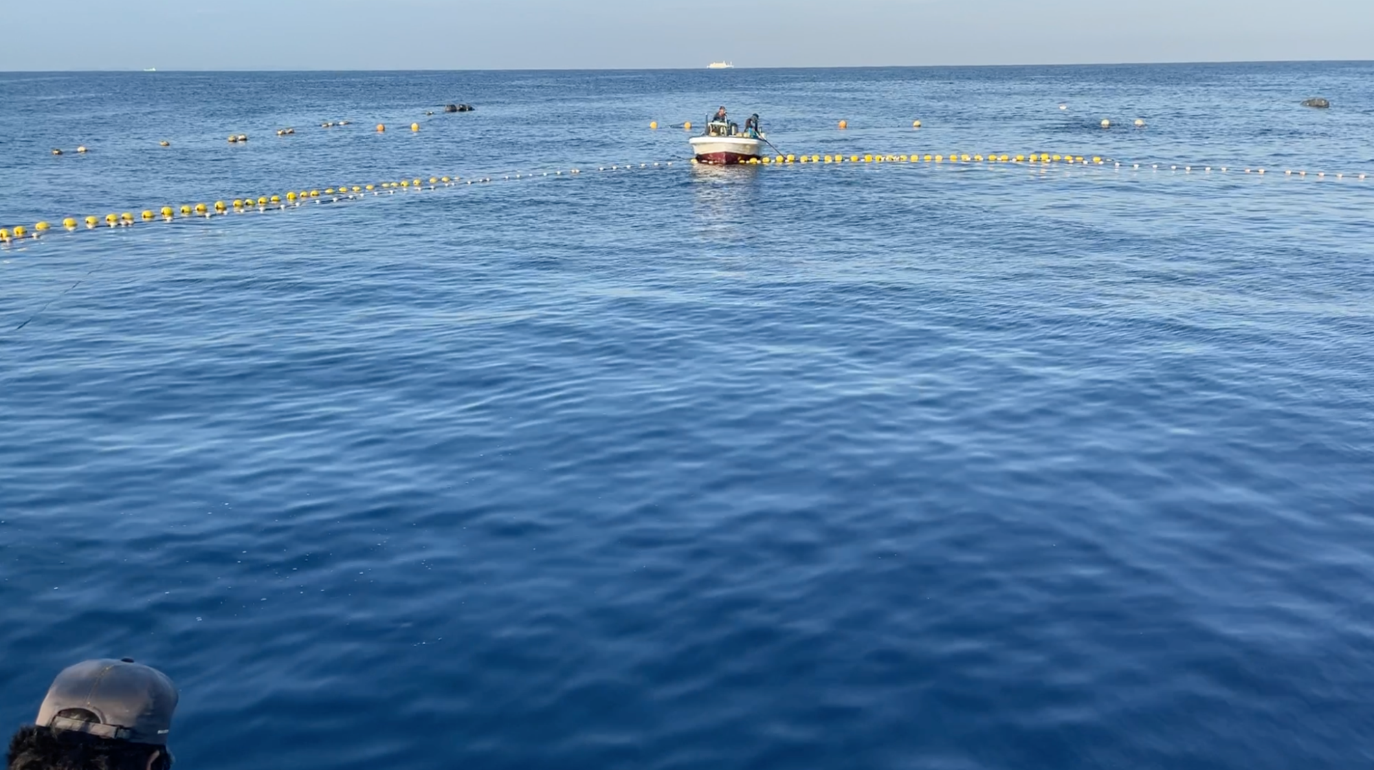 沖に船を走らせること約10分。網が仕掛けられた場所に到着。漁師さんたちが網を手繰り寄せています。