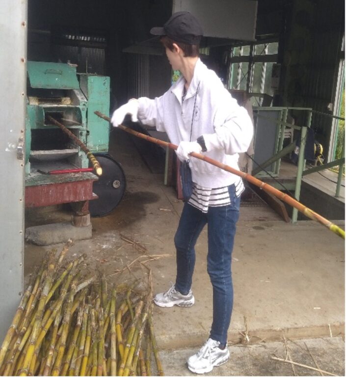 作業は午前中早い時間から始まります。葉っぱやゴミを除いたサトウキビ(結構重い)を、次々と圧搾機に投入していきます。これがなかなか重労働…。最初は重くて1本ずつ入れていたら、「そんなんしてたら時間かかるさ~」と言われ、いっぺんに3~4本ずつ投入していったので、ここでもう軽く筋肉痛になりました(笑)。