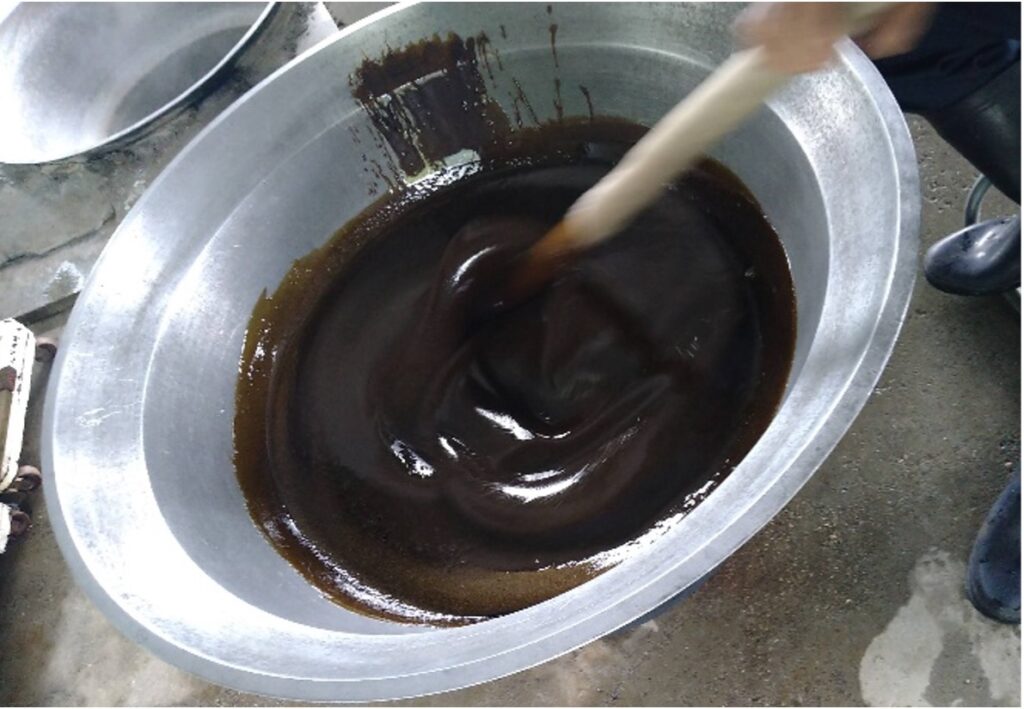 こちらは作り方からして少し違うんです。サトウキビを専用の圧搾機に入れてジュースを搾り取り、それをそのまま高温でじっくり灰汁を取りながら長時間煮詰めていきます。煮詰めた結果とろとろのペースト状になった黒糖が冷めて固まらないうちに台の上にあけ、「人の手で」一口サイズに小分けにしていくという、大変手間のかかった作業になります!