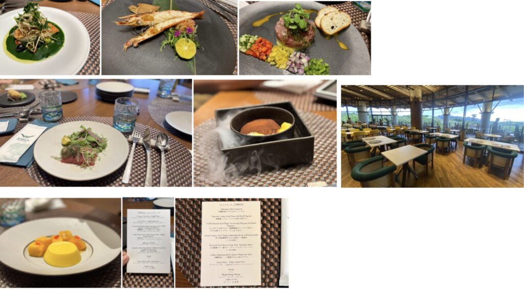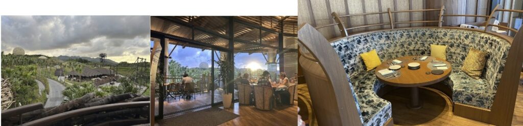 夕暮れ時に訪れると、ジャングリア沖縄の森や海を見渡せる絶好のロケーションで、1日の冒険を贅沢に締めくくれます。ディナーは予約必須なので、事前に計画しておくのが安心。今回いただいたのは「JUNGLIAスペシャルコース」と「セレクトコース YAMBARU」。