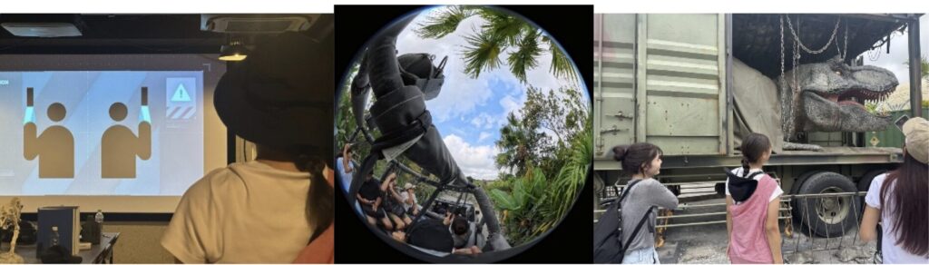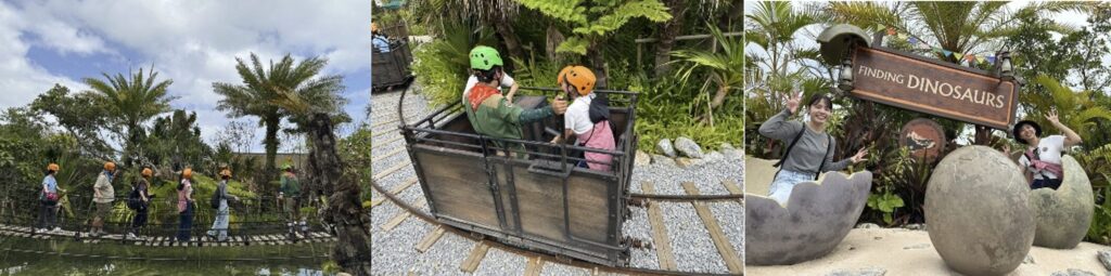 いよいよ冒険のはじまり!ジャングリア沖縄の目玉アトラクション「ダイナソーサファリ」は、ジャングルの中を10人乗りの装甲車で進むスリリングな体験型ツアー。運転は頼もしい隊員におまかせで、ゲストはまるで探検隊の一員になったような気分に。でこぼこ道や川の上を走るたびに車体が大きく揺れ、アトラクション感も抜群です。木々の間から突然現れるリアルな恐竜たちの姿や咆哮には、思わず全員が歓声をあげてしまうほど!途中には恐竜との記念撮影スポットもあり、ドキドキとワクワクが止まりません。