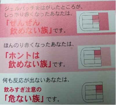 私も自身ではお酒は強いと認識していたのですが、若い頃よりはさすがに弱くなっているよなぁ~?と思って、パッチテストを受けてみることにしました。テスト方法は、みなさん大体ご想像の通り。アルコール分が塗られた小さいパッチを腕の内側などに貼って少し置き、その部分が赤くなるかどうかで判定するというものです。