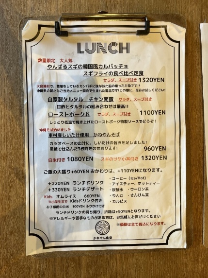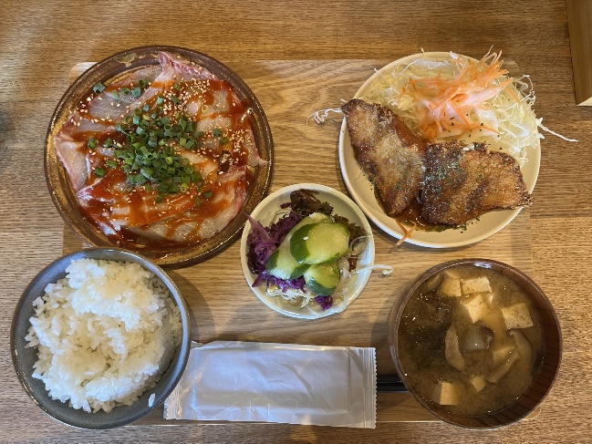 「やんばるスギの韓国風カルパッチョ スギフライの食べ比べ定食」は数量限定で、スギは沖縄県大宜味(おおぎみ)でとれた魚を使用。火の通っていない新鮮なカルパッチョと衣がサクサクでスギのうまみが中に詰まっているスギフライを1つの定食で味わうことができてとても贅沢な1品でした!!