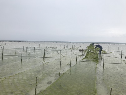 干潮に合わせて、網を腰の高さくらいまで持ち上げて