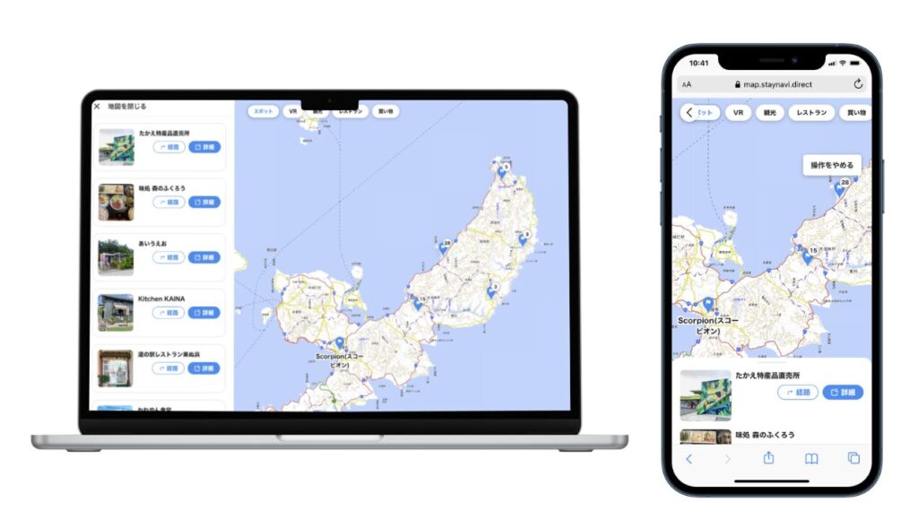 やんばるエリアに点在する観光スポット、自然体験、文化体験、イベント情報などを、地図上で一覧化。初めて訪れる観光客でも、エリア全体の魅力を把握しやすい設計としています。